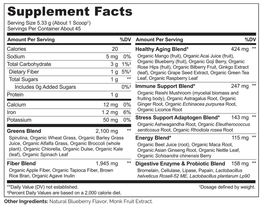 ORGANIC SUPERFOODS : Made with nutrient-packed organic whole foods, including raw greens like spirulina, barley grass, alfalfa, wheat grass, chlorella, kale, spinach, and broccoli, and fruits like acai, blueberry, and goji berries.
