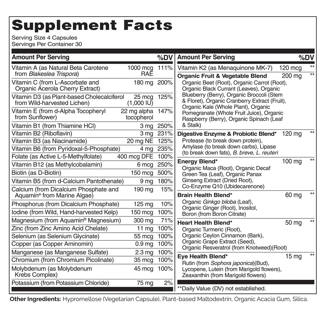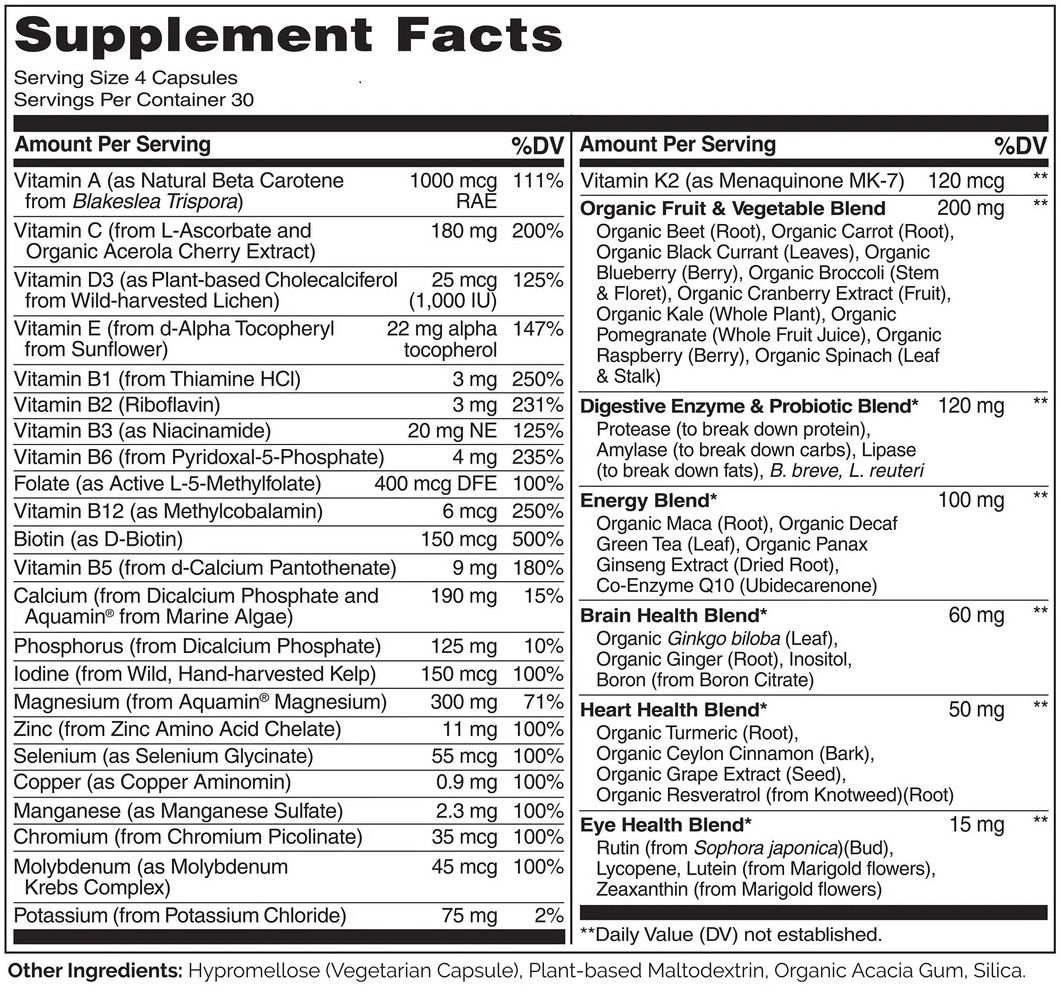 Beta-carotene with full-spectrum carotenoids and Vitamin K2 have many proven benefits for our health as well. This product also uses the active forms of B vitamins, includes vegan Vitamin D3 from lichen, and provides meaningful servings of minerals. An organic fruit and vegetable blend is included for phytonutrients, too!