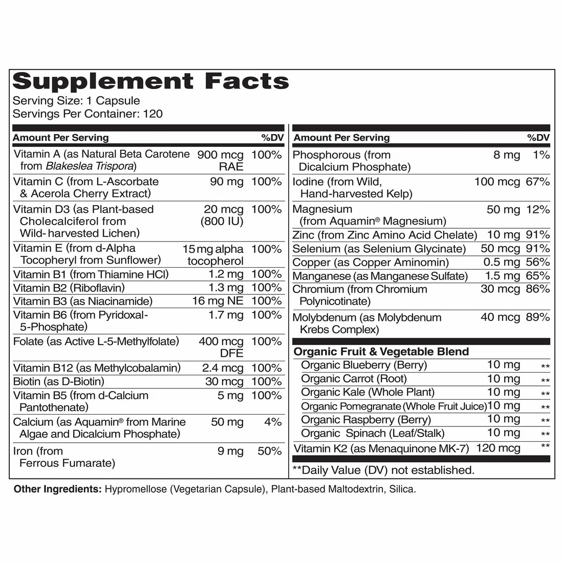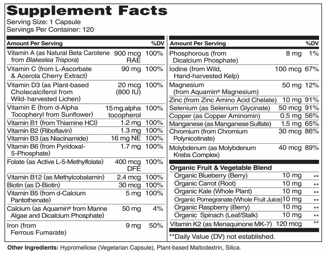 The One Daily multivitamin, as the name suggests, only requires one capsule per day. Our Whole Food multivitamins include more complete and comprehensive ingredients, so their serving size is 4 capsules per day.