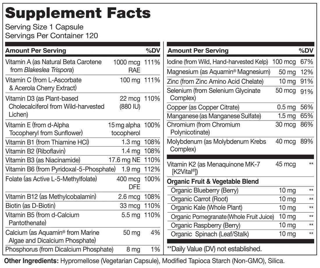 The One Daily multivitamin, as the name suggests, only requires one capsule per day. Our Whole Food multivitamins include more complete and comprehensive ingredients, so their serving size is 4 capsules per day.